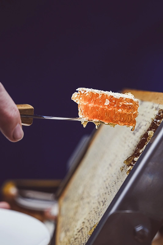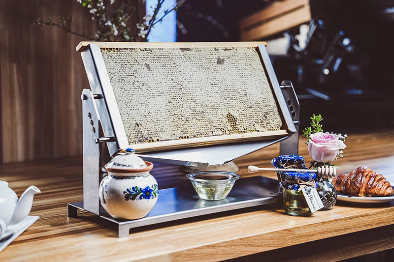 We offer our signature honeycomb (spleen honey) with a custom-designed stand, created exclusively for luxury hotel environments.